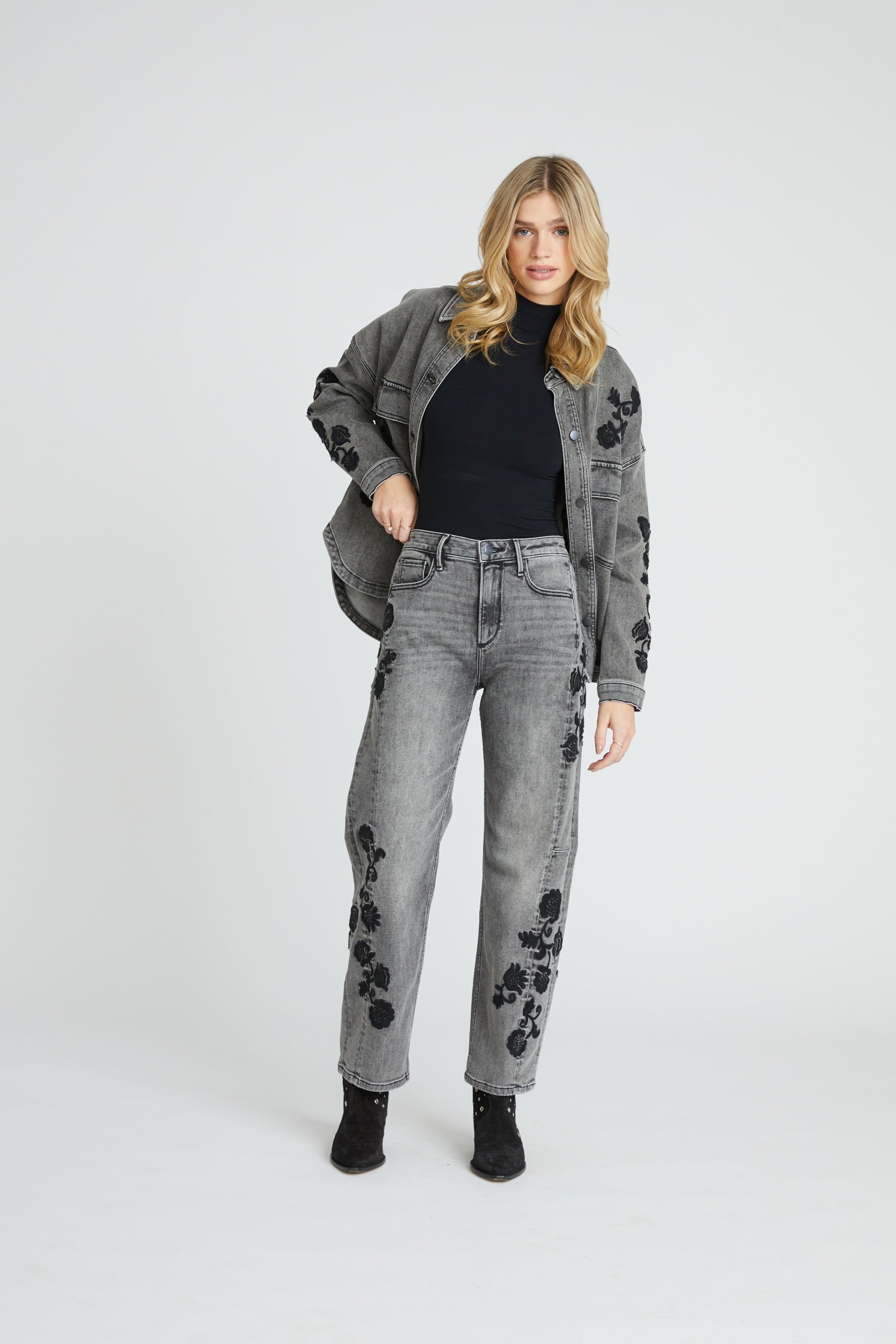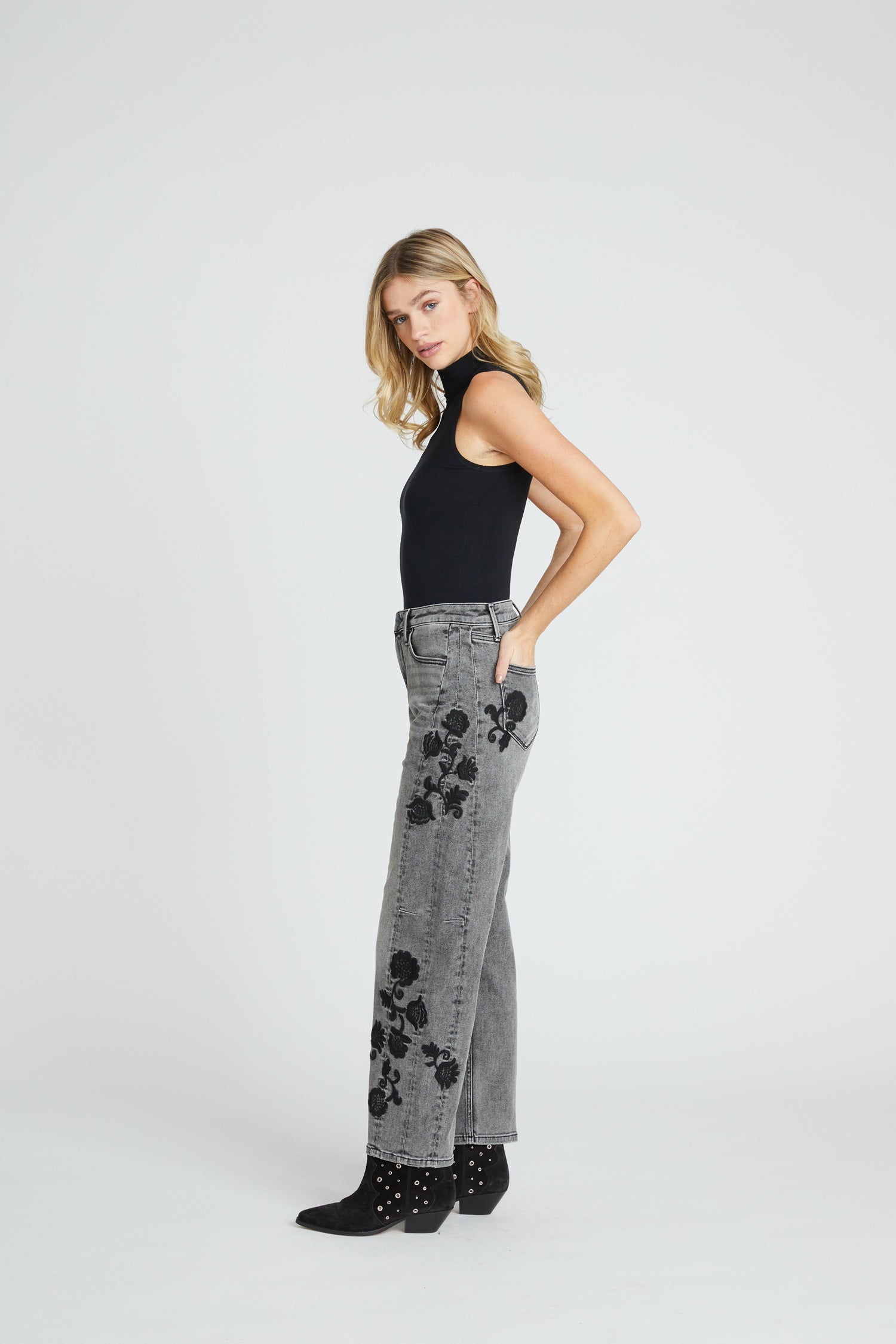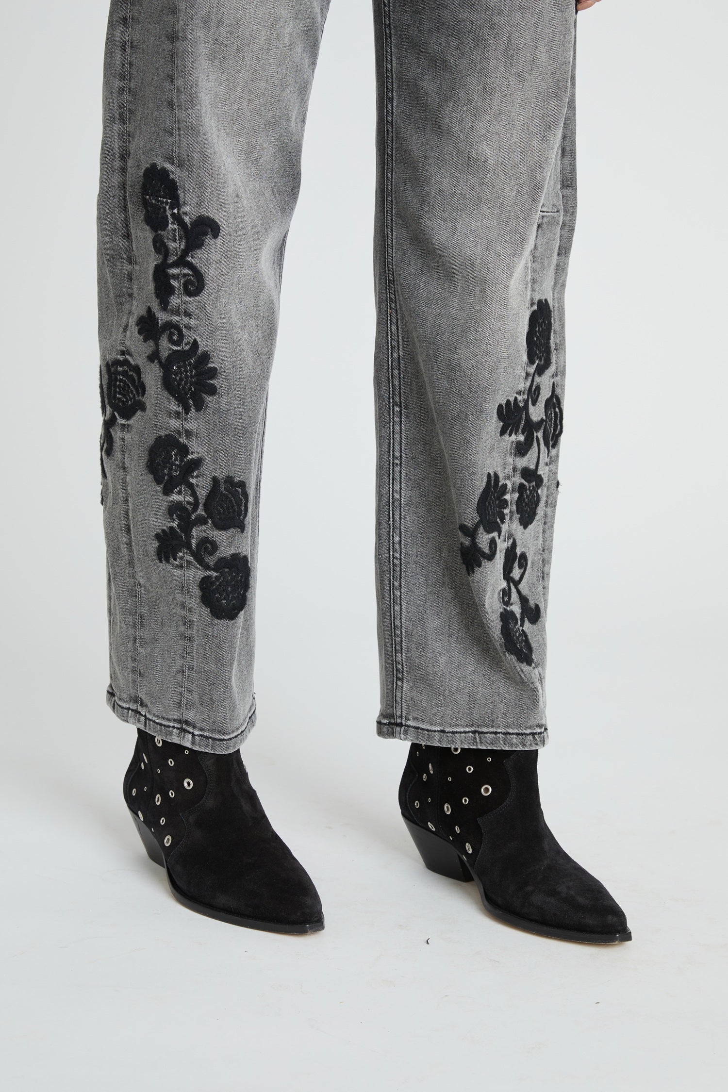 Sleek, sculpted, and effortlessly statement-making—the Elaine Barrel in Black Brocade redefines modern denim with an artistic twist. This high-rise silhouette in a dark grey wash features tonal black floral embroidery that trails along the leg for a subtle yet striking effect. The softly curved barrel shape adds dimension and a contemporary feel, while the premium stretch denim ensures all-day comfort and structure.