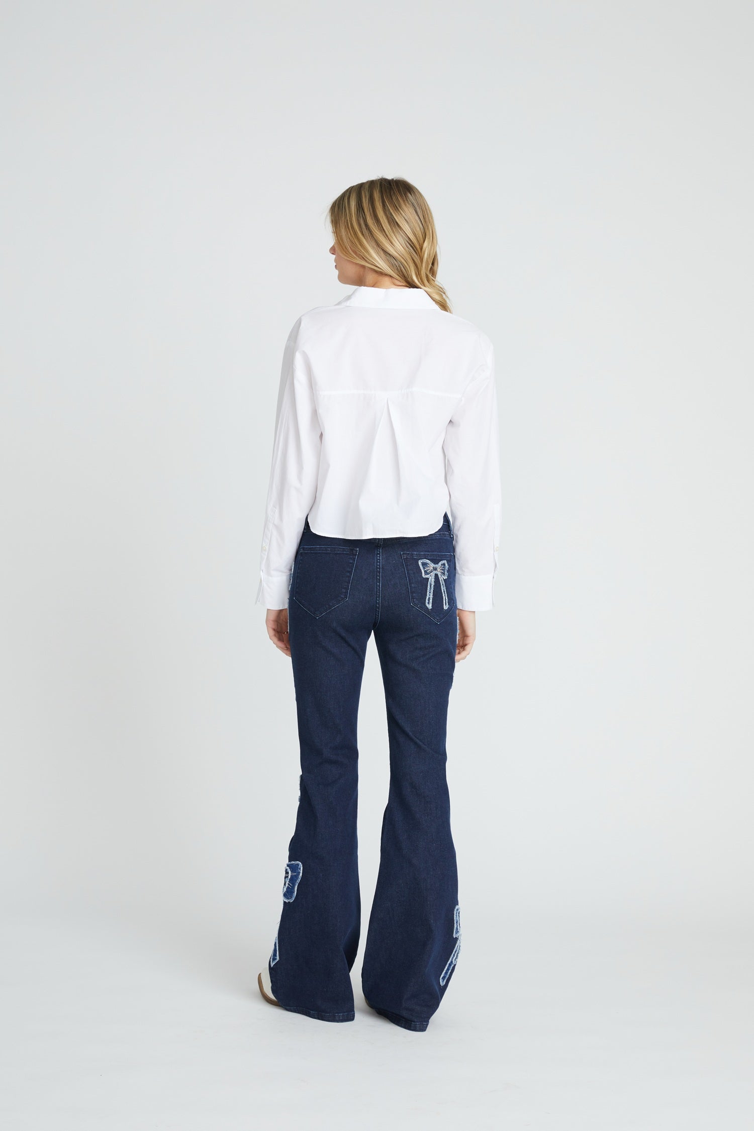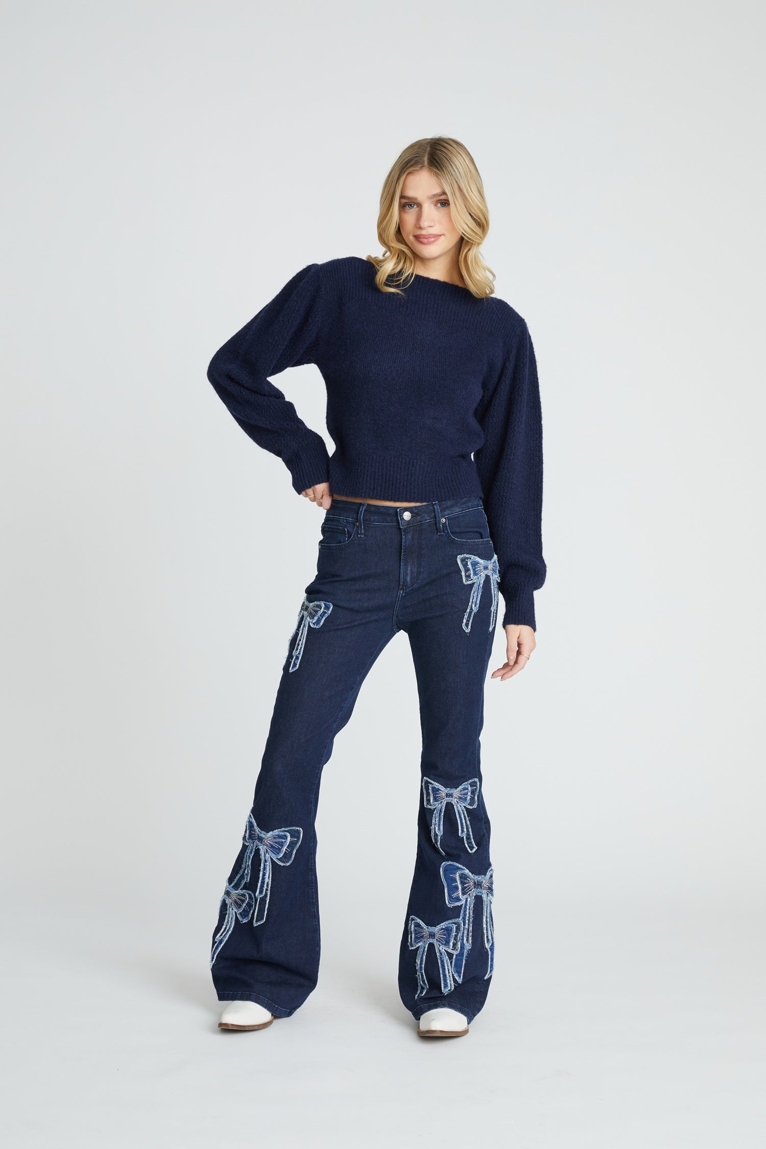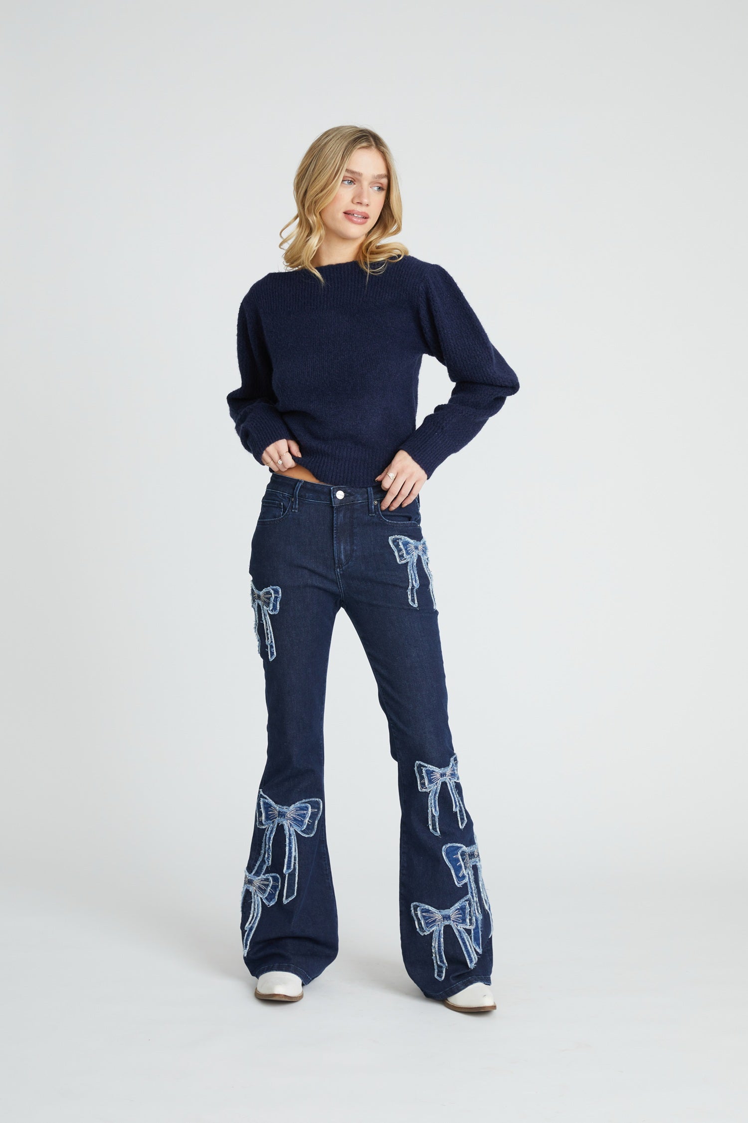 The Farrah Flare in Bow What Fun! turns classic denim into a statement piece. Designed in a deep dark wash, this style features playful bow applique cascading along the leg — a perfect mix of feminine charm and bold personality. The flared silhouette elongates the legs while maintaining a flattering, high-rise fit that hugs through the hips and thigh before flowing out to a dramatic flare. Crafted with a soft stretch for comfort and structure, this style adds an elevated twist to your everyday denim rotation.