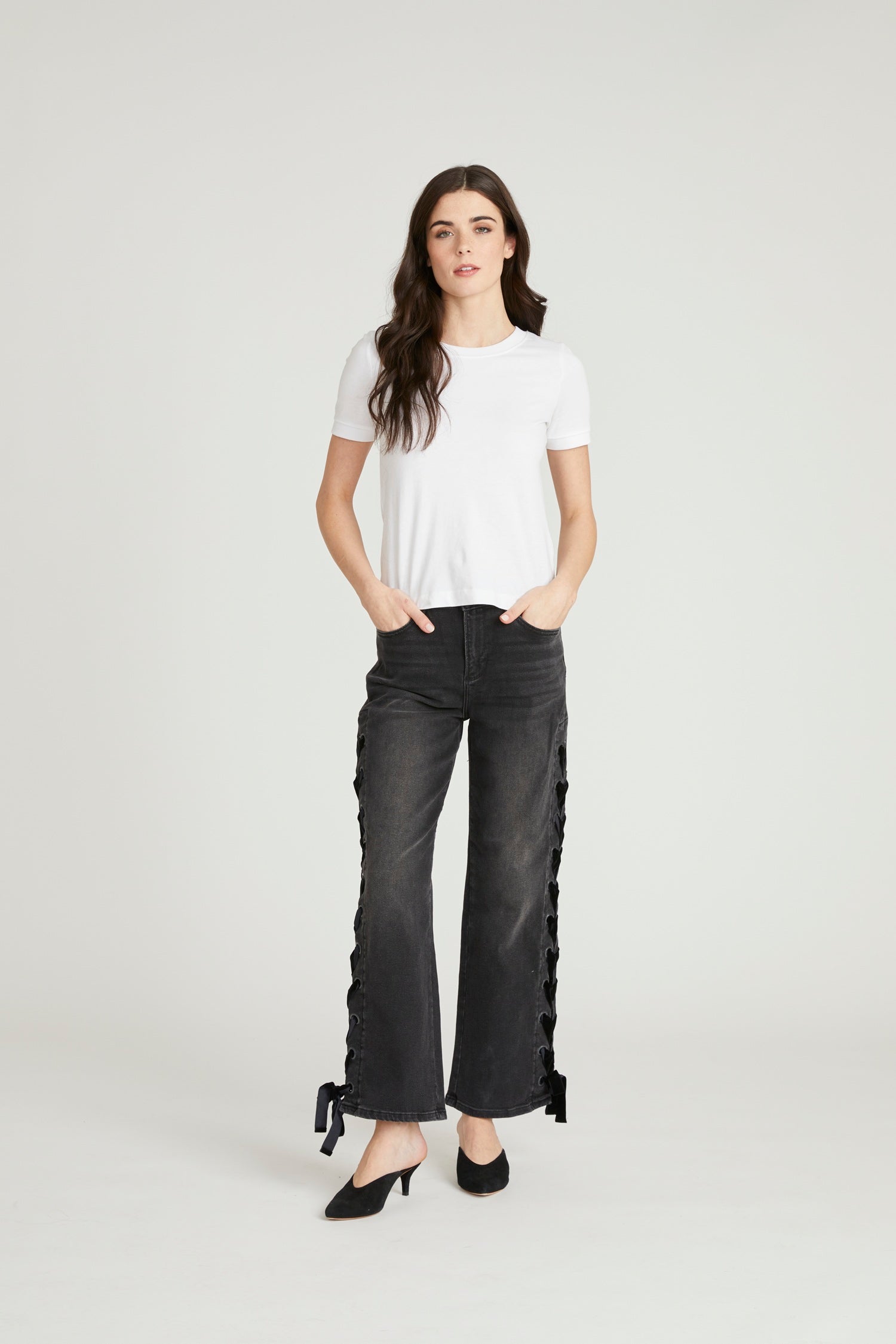 Effortlessly chic with a touch of edge — the Lacey Relaxed Straight in Black Velvet redefines classic denim with elevated detail. Designed in a soft black wash, this style features plush velvet trim lacing down each side for a refined, statement finish.