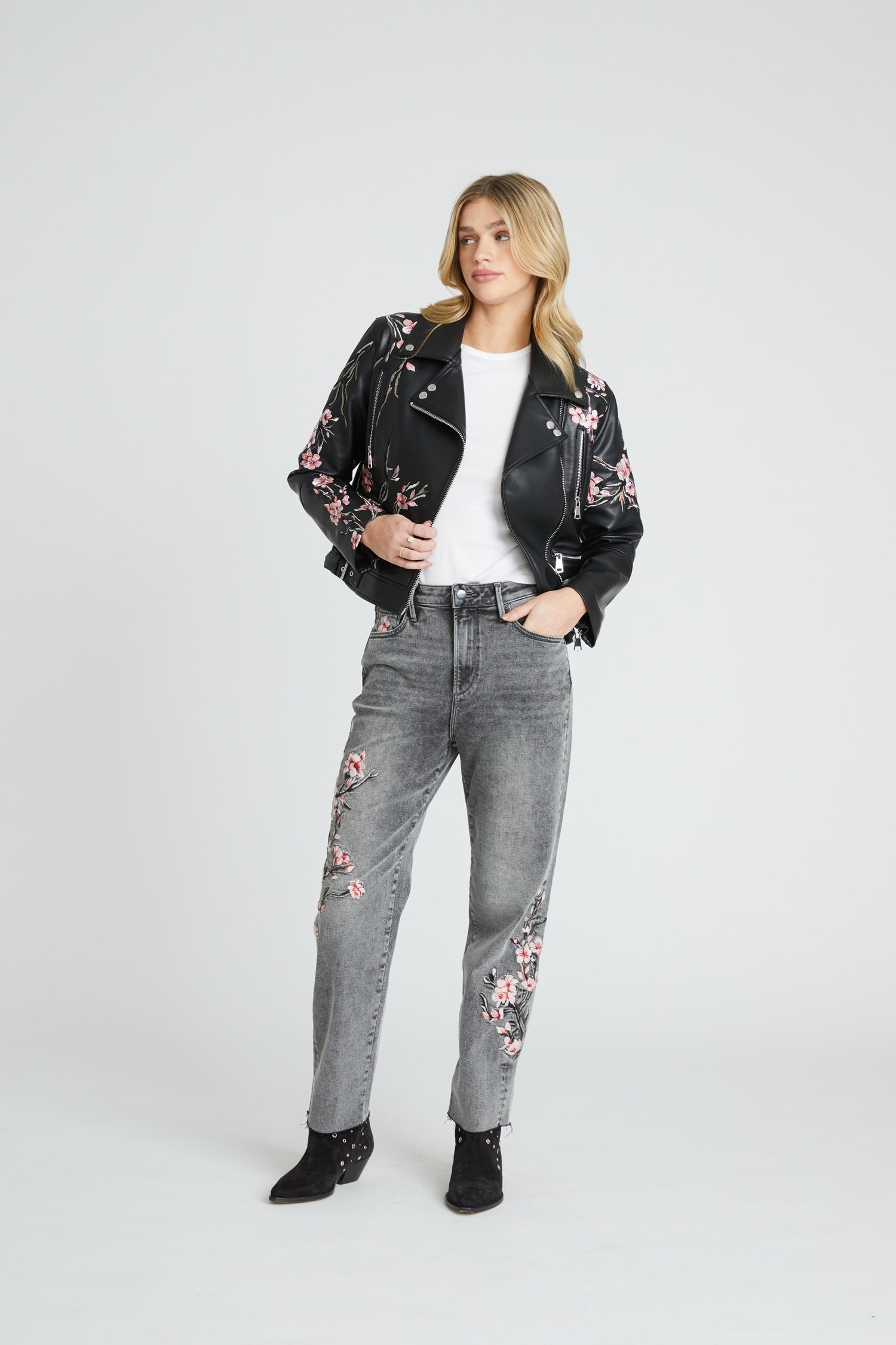 The Royce Straight in Sakura brings soft femininity to an everyday favorite. This grey wash denim is accented with cherry blossom embroidery in shades of pink and ivory, positioned along the leg for an elegant, eye-catching detail. Subtle fading gives the wash a naturally lived-in feel, while the straight leg cut keeps the silhouette clean and versatile. Comfortable stretch denim ensures an easy fit that moves with you throughout the day.