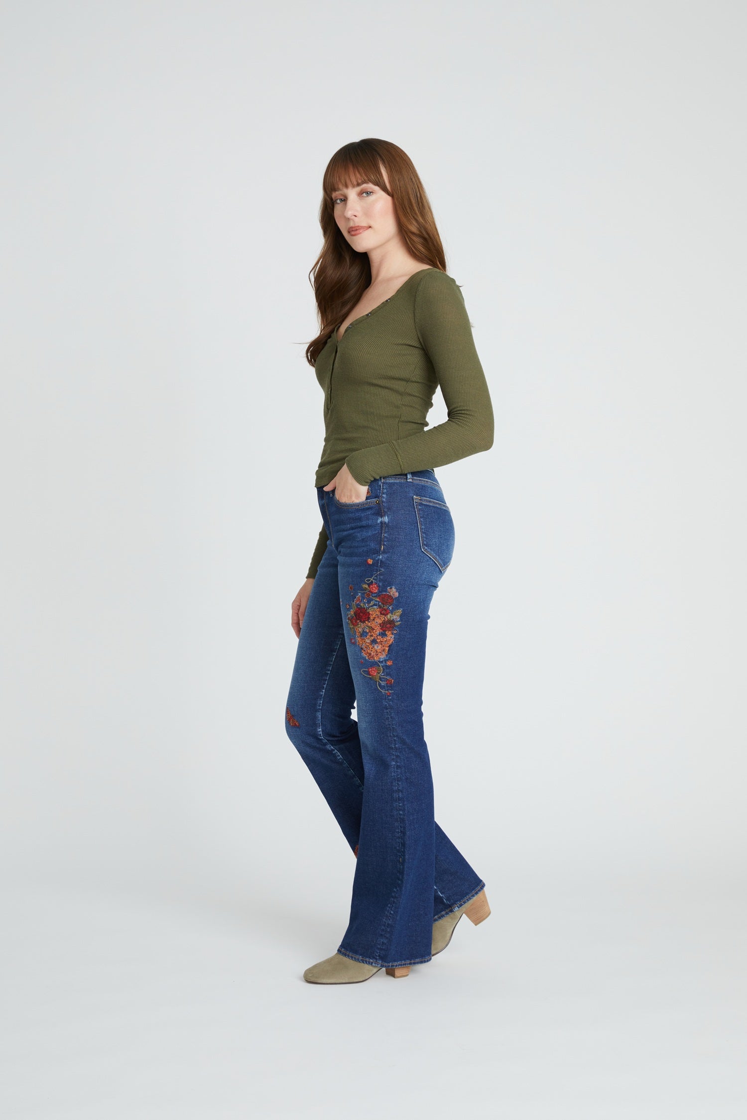 The Wyatt Boot Cut in Skulls and Roses blends edgy and romantic details for a standout denim look. Crafted in dark wash denim, it features a full skull embroidered on the side of the leg, with delicate rose vines extending outward, creating a dramatic and artful effect.