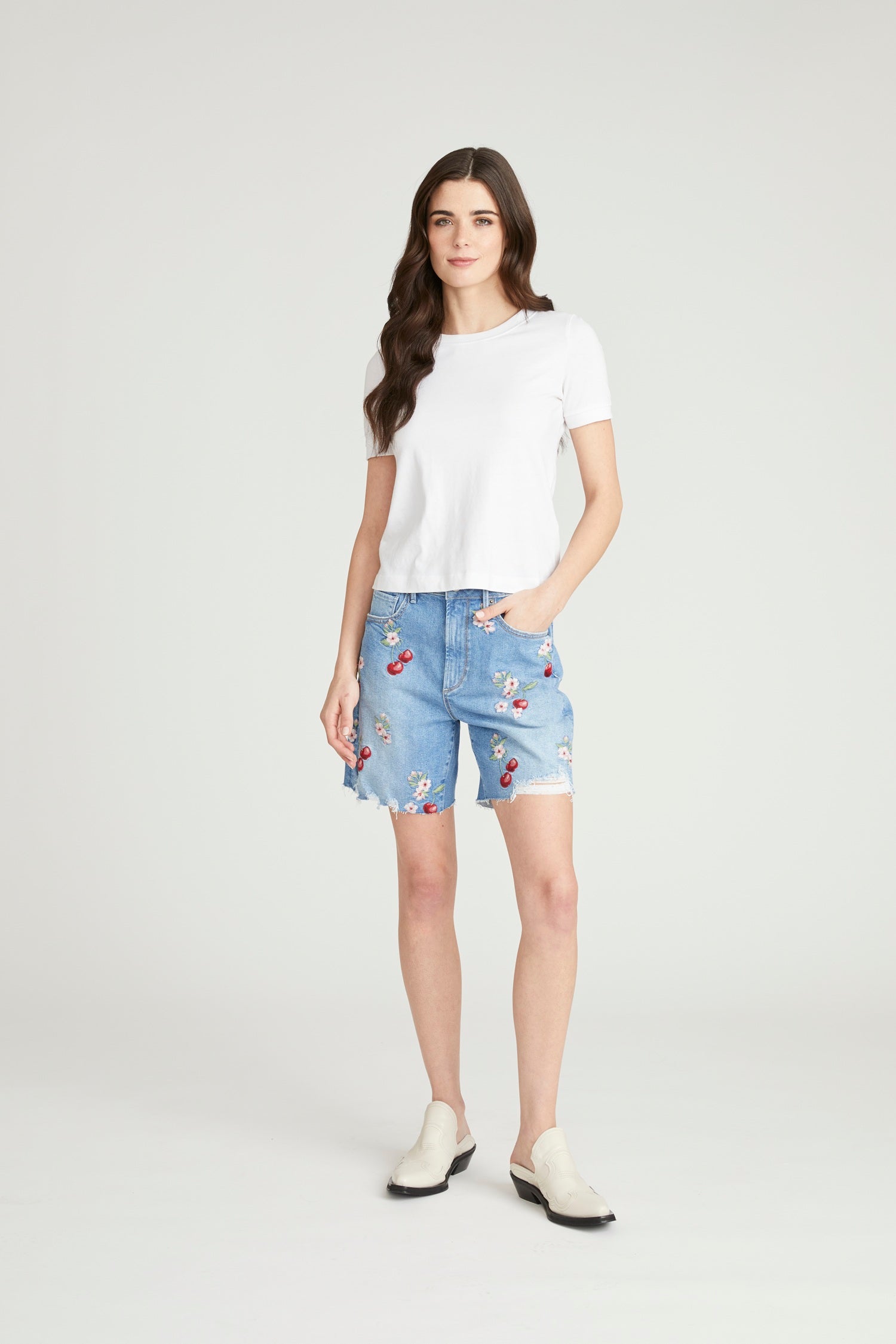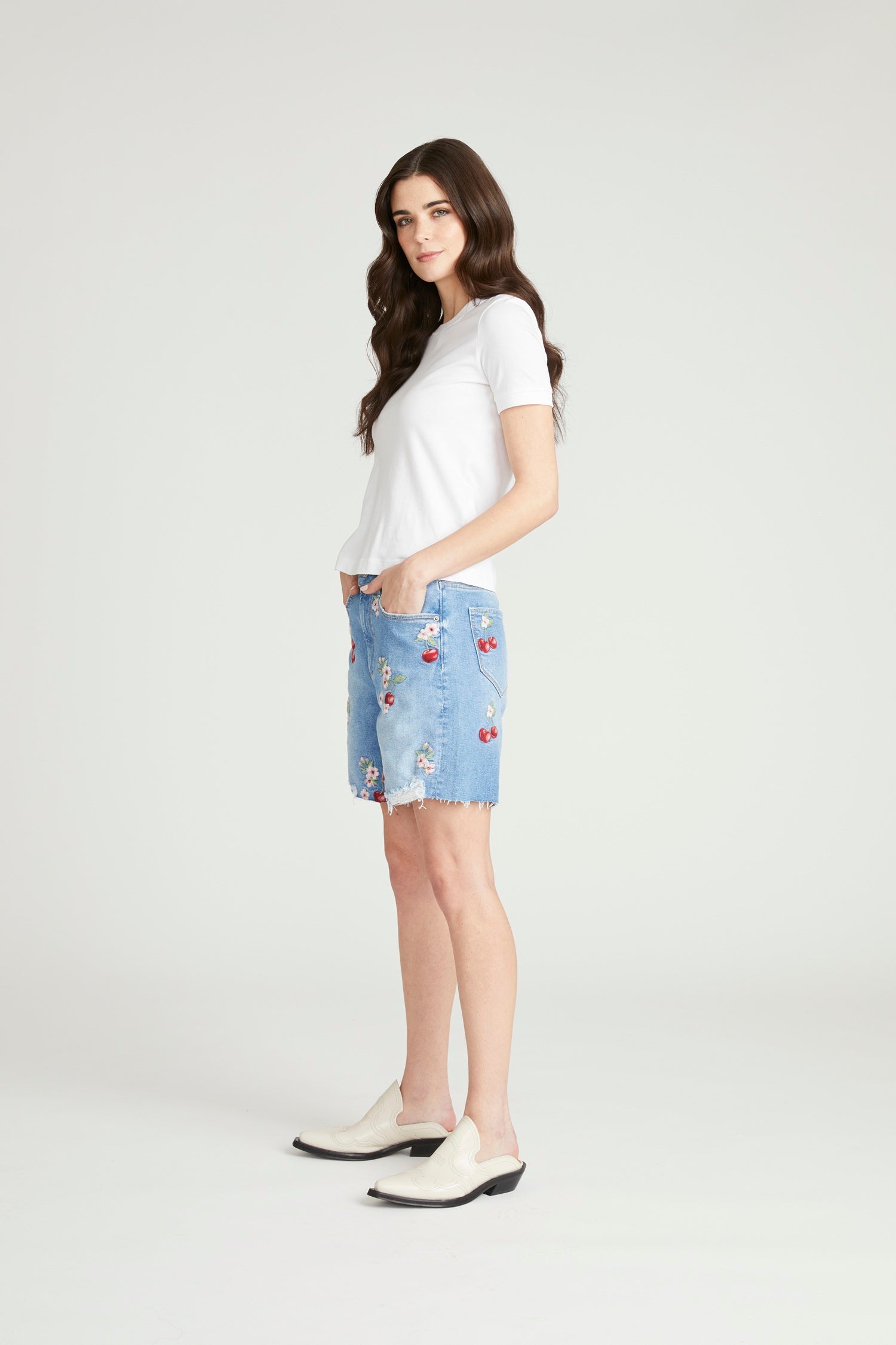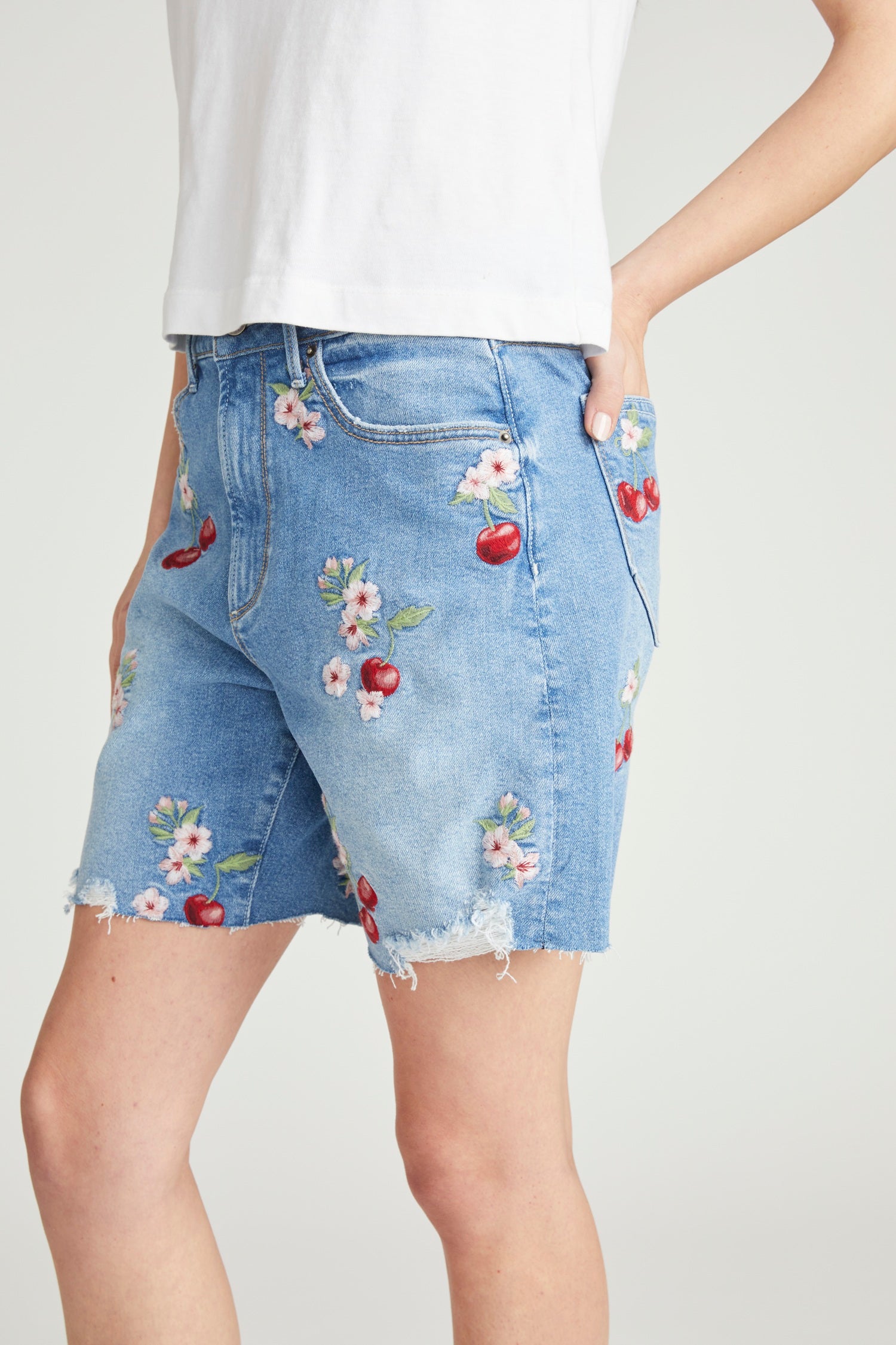 The Cayla Short in Cherry On Top is a fresh new silhouette for Spring 2026, bringing playful charm to a classic denim short. Designed in a light wash, this style features delicate cherry embroidery scattered throughout for a sweet, standout look. Finished with subtle distressing and a relaxed yet flattering fit, the Cayla Short is the perfect warm-weather essential with a whimsical twist.