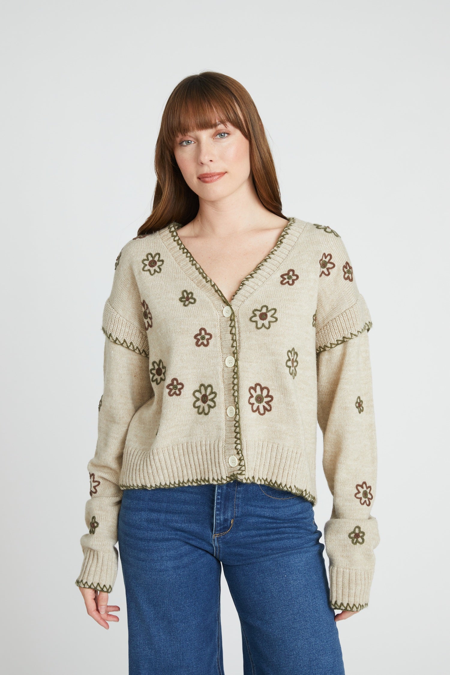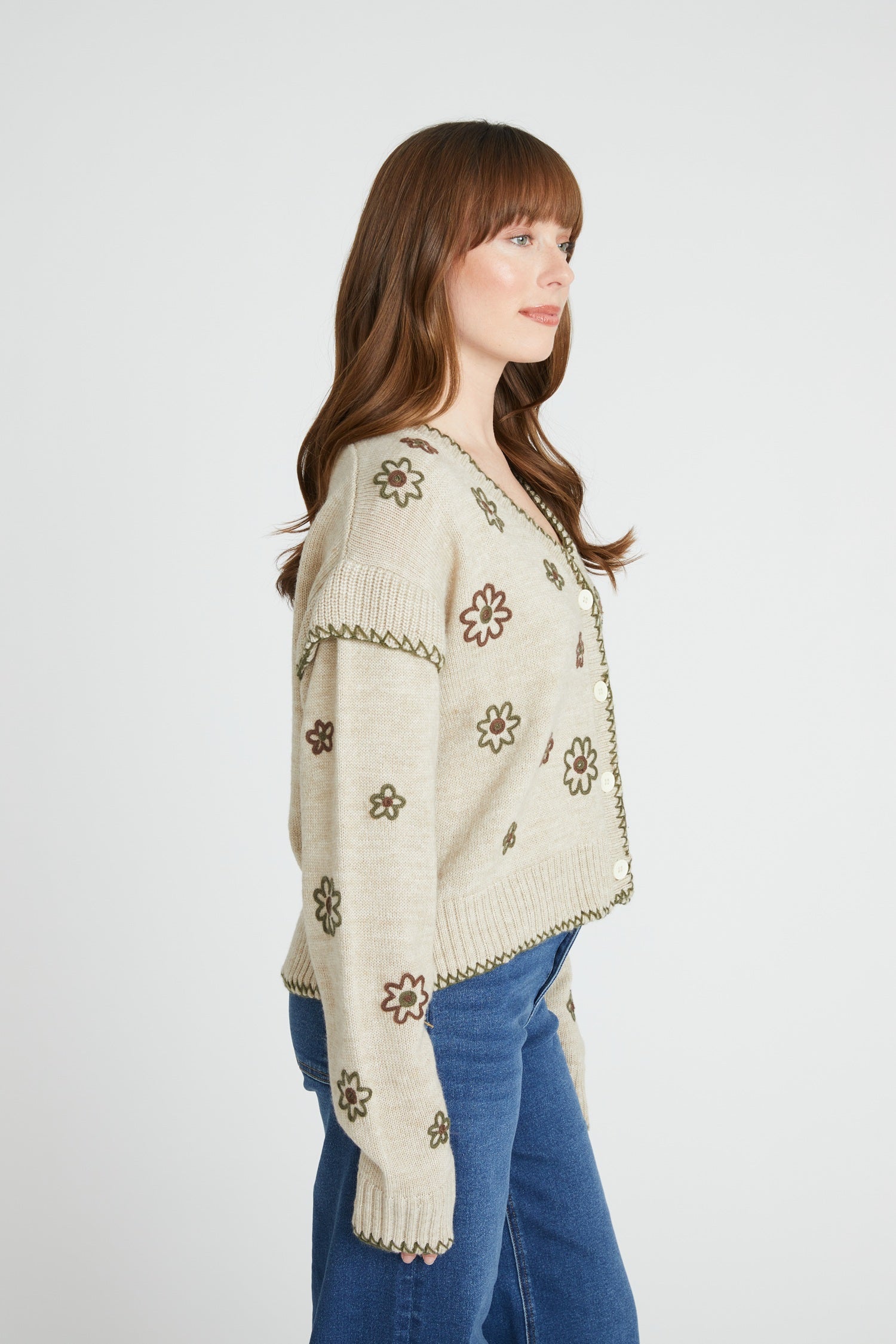 The Cardigan in Florals blends cozy comfort with Driftwood’s signature embroidery charm. Crafted in a soft light brown knit, this 100% acrylic button-front cardigan features whimsical floral embroidery throughout in earthy green and rust tones. A scalloped whipstitch trim accents the neckline, cuffs, and hem, adding a handcrafted finish. The relaxed silhouette and subtle shoulder ruffle detail lend a feminine, vintage-inspired touch that’s perfect for layering over your favorite denim or dress.