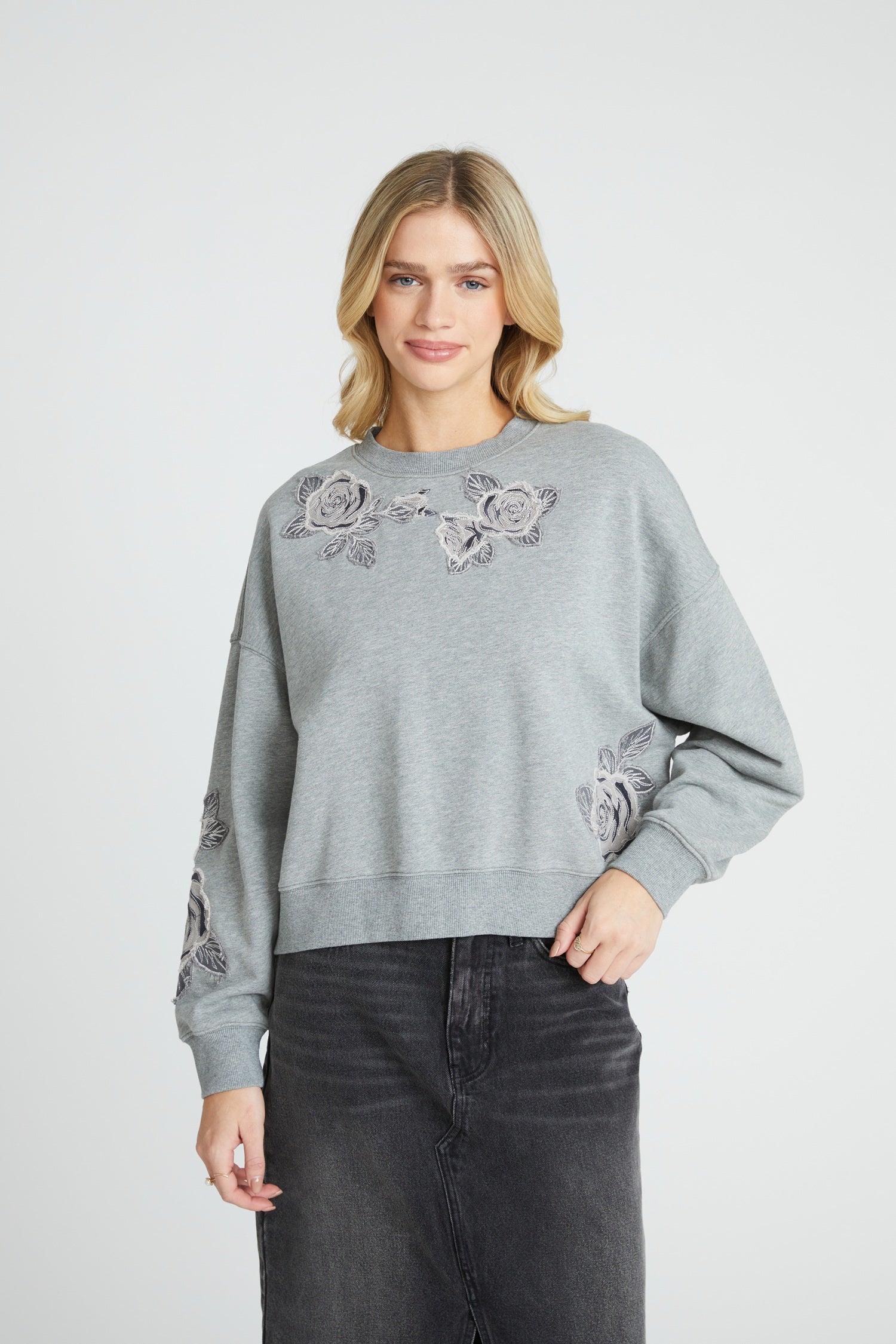• Details: Tonal rose embroidery across chest, sleeves, and lower back; heather grey base