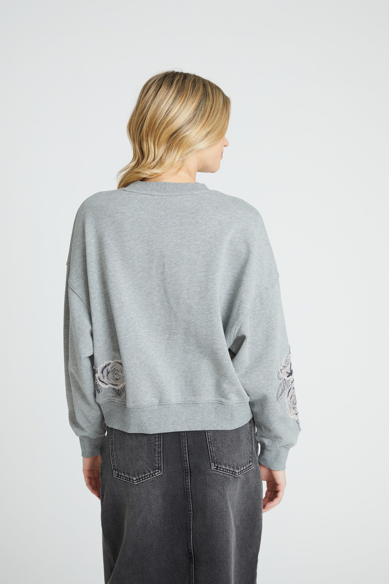 The Teddy Sweatshirt in Rose Patchwork in grey brings subtle sophistication to a laid-back favorite. Designed in a soft heather tone, this crew neck sweatshirt features tonal rose embroidery that winds across the chest, sleeves, and sides for a look that’s both understated and detailed. Made from 100% cotton, it’s cozy yet breathable—perfect for effortless layering or pairing with denim. The delicate stitchwork and neutral palette make it a versatile statement piece you’ll reach for season after season.