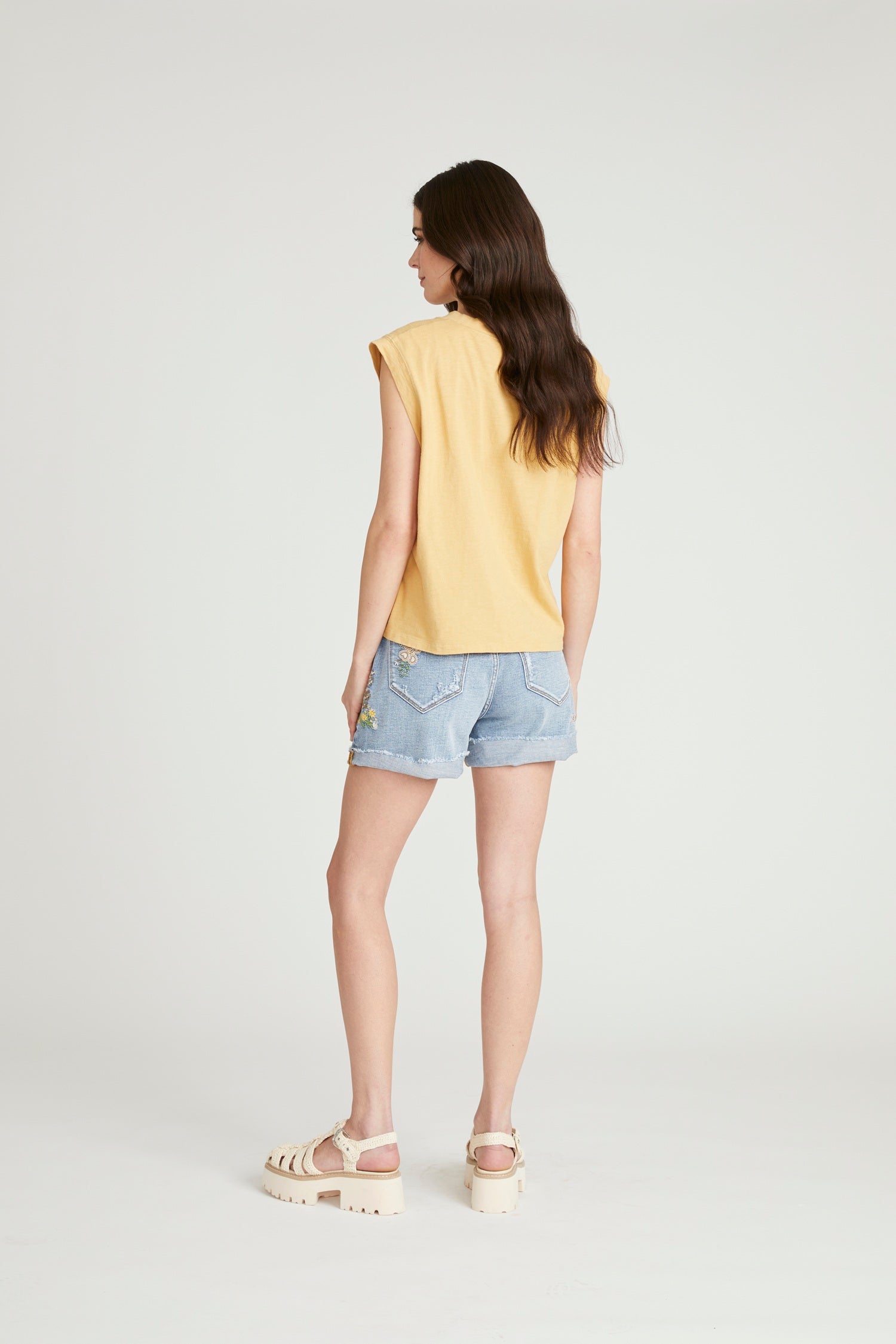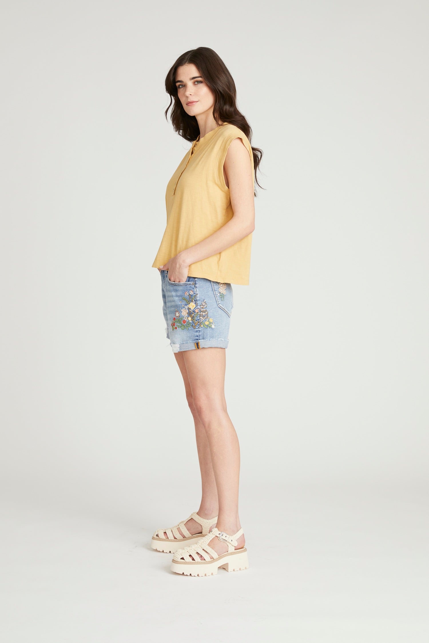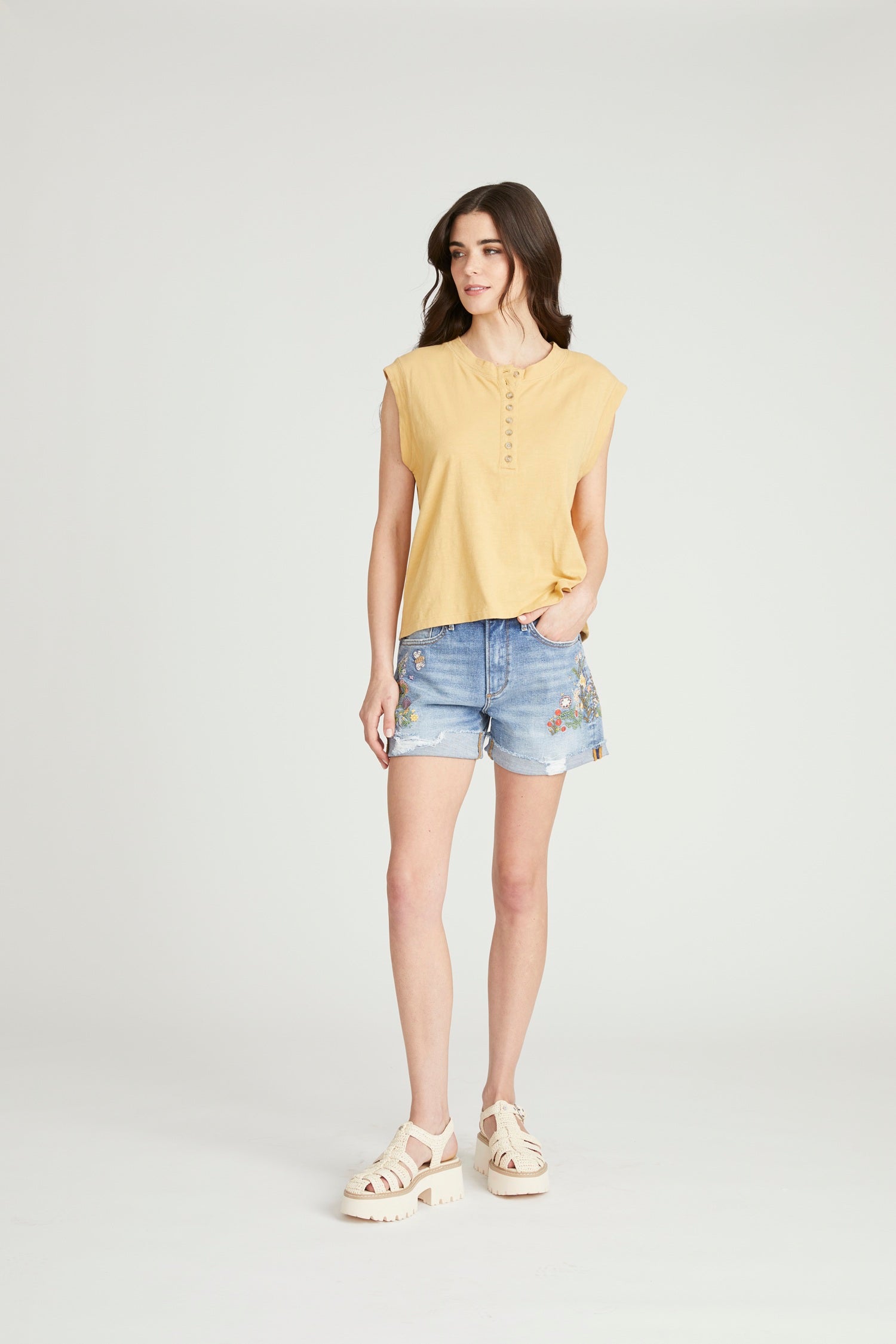 • Details: Medium wash denim, floral embroidery detailing, rolled hem, classic five-pocket styling, zip-fly with button closure