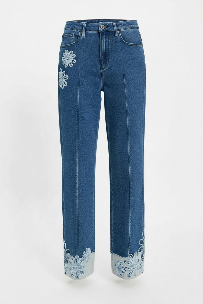 • Details: Dark wash knit denim, five-pocket styling, seamed details throughout, center front leg seams, embroidered daisy patchwork accents at cuffs, finished hem