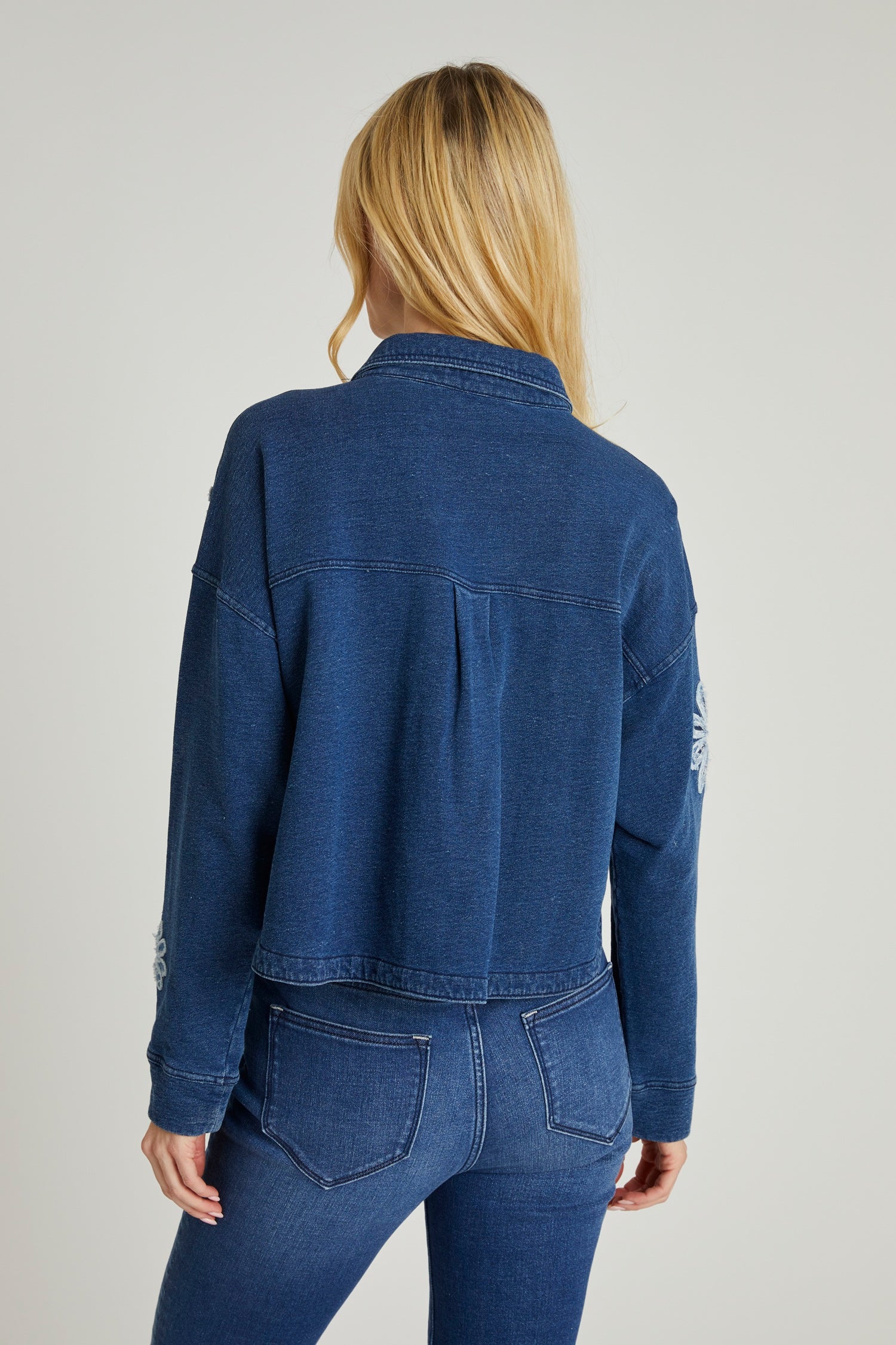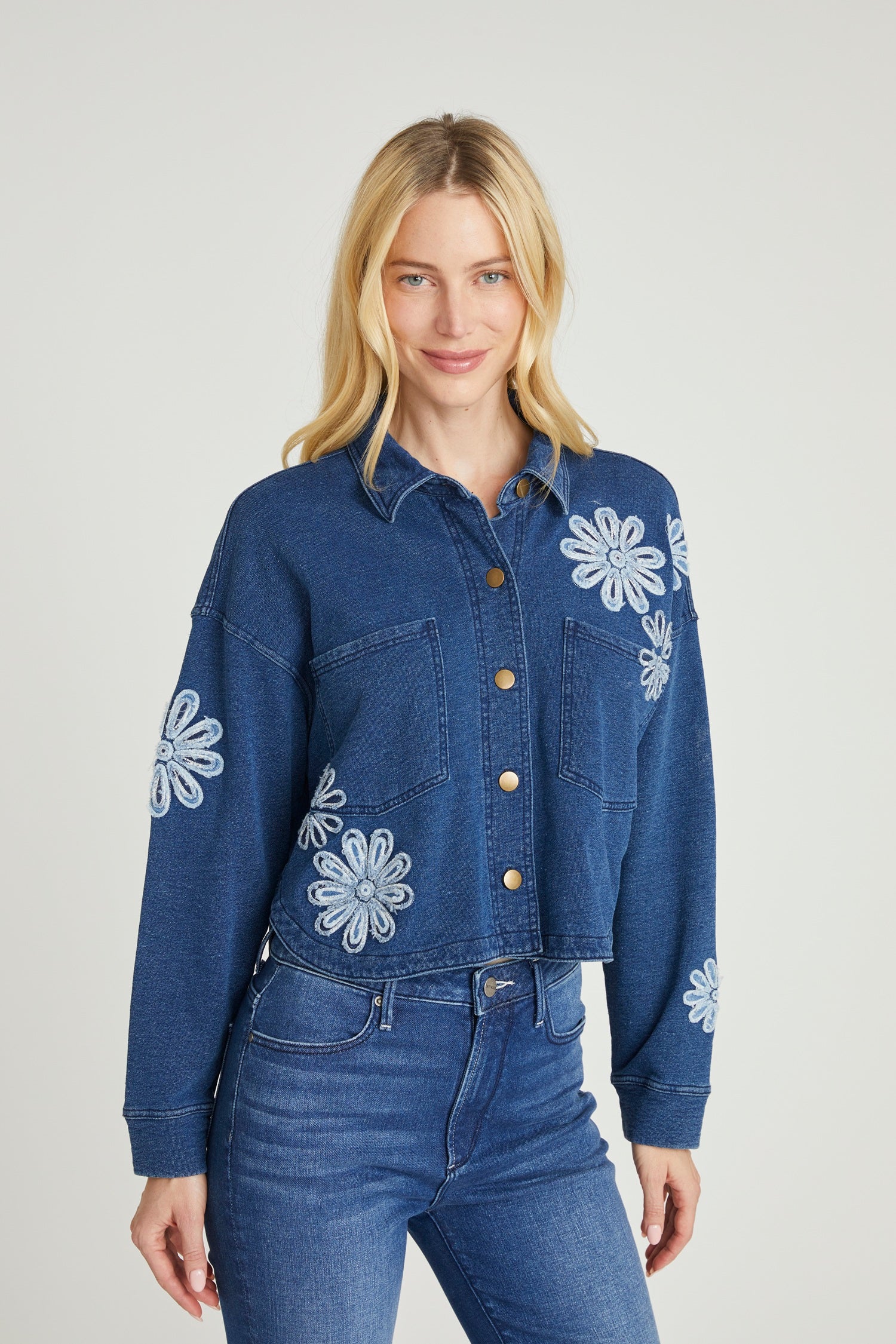 The Bryn Shacket in Daisy Patchwork blends the ease of a shirt with the versatility of a lightweight jacket. Designed in a dark wash knit denim, this piece features daisy patchwork embroidery scattered throughout for a soft, feminine contrast. Slightly cropped at the waist, the relaxed silhouette makes it perfect for layering while still feeling polished and effortless.